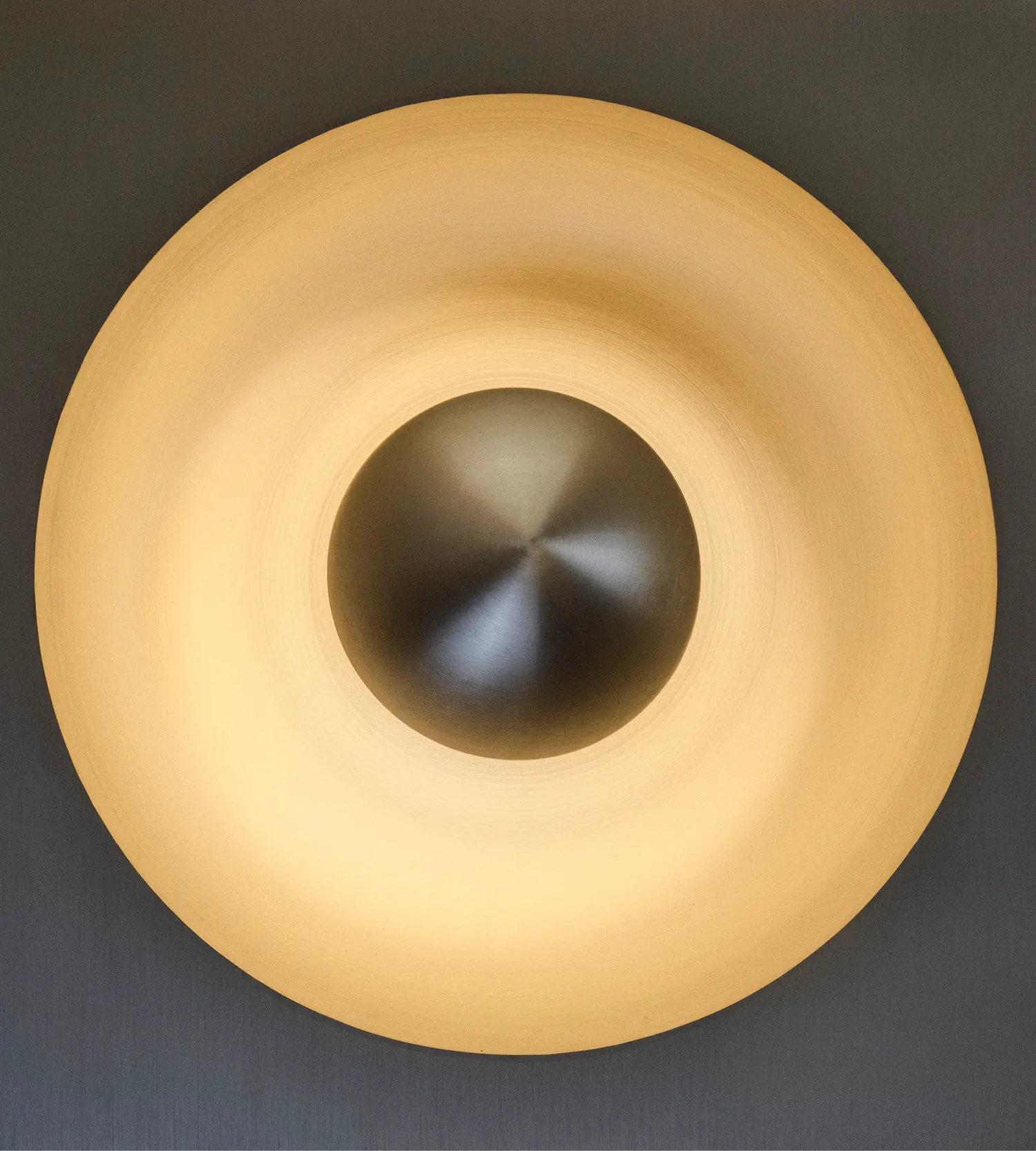 Kare formu ve merkezdeki dairesel girintiyle hem mimari hem heykelsi bir görünüm sunar. Işığı yumuşak bir şekilde yansıtarak mekânda dengeli bir atmosfer oluşturur. Göz alıcı alüminyum yüzeyiyle modern iç mekanlarda güçlü bir odak noktası yaratır.